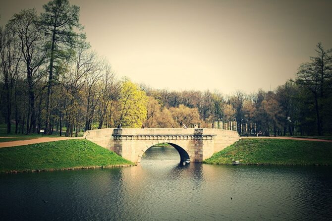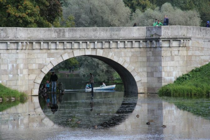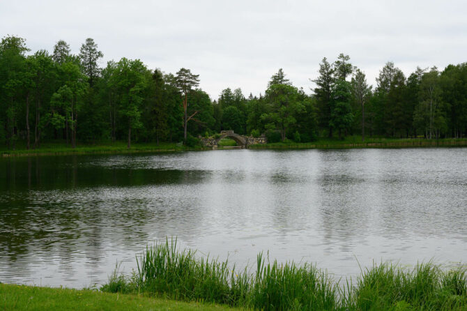 Горбатый мост проходит через Длинный остров и соединяет Белое озеро и Серебряное озеро. Автором этого романтического сооружения, Горбатого моста, был архитектор А. Д. Захаров. Разрешение на работу с мостом было получено в ноябре 1800 года. Мастер нашел правильное соотношение между размером Горбатого моста, декоративным оформлением и окружающим ландшафтом.