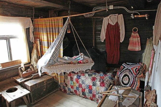 В музее воссоздан быт крестьянской семьи конца XVIII — начала XX века. В среднем красном углу находится икона с лампадой. На русской печи, занимающей центральное место в музее, стоят глиняные горшки и другая утварь. На потолке — сушеные травы и можжевельник, посередине — деревянный стол и скамейки, по углам — детская колыбель, сундук с вещами, прялка. Из одежды видна праздничная одежда крестьянки — летнее платье и кофты. По словам местных жителей, среди экспонатов музея есть только одна личная вещь от Арины Родионовны — полотняная торба.