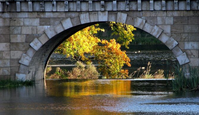Еще одна уникальность Горбатого моста заключается в том, что он проходит через водную полосу шириной 25 метров, которая не только соединяет две части воды, но и такие достопримечательности как «Павильон Орла» и «Большая Пристань».