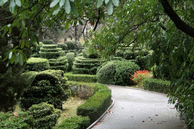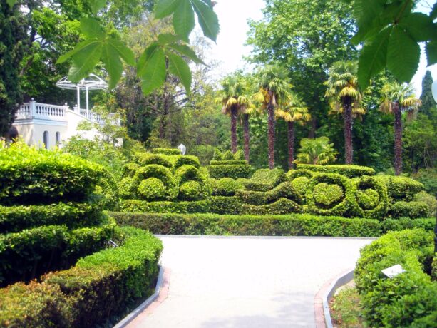 На территории Гурзуфского парка можно увидеть свыше 110 разновидностей декоративных кустарников и деревьев, при оформлении которых используется техника фигурной стрижки. Посетители с удовольствием прогуливаются по длинным аллеям, рассматривая растения, встречающиеся на пути:
