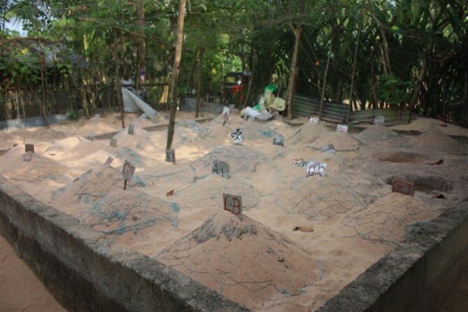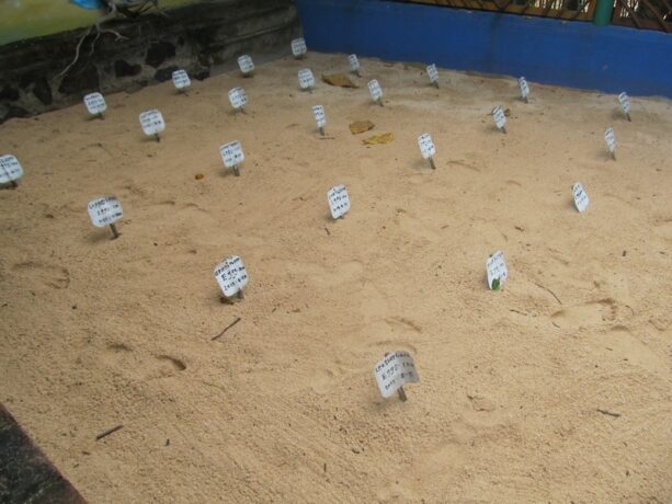 Возле каждой “закладки” стоят таблички с названием черепашки и днями, которые яйца провели в песке. На Шри-Ланке обитают 5 видов черепах, и все они находятся под охраной.
