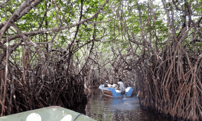 Самой манящей частью прогулки по Голубой Лагуне являются заросли мангрового леса, настолько густые, что их можно потрогать руками из лодки. Узоры ветвей закрывают небо, и только слышно, как плещется вода, и поют птицы. Туристы чувствуют себя настоящими первопроходцами.