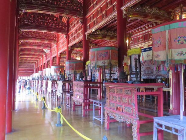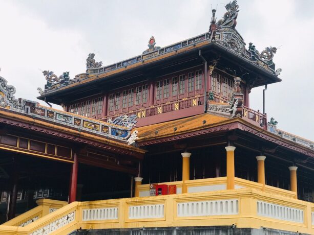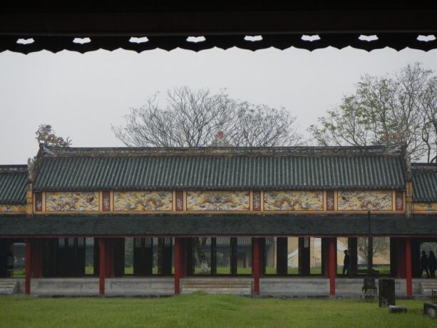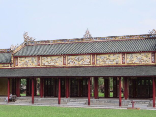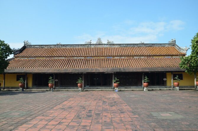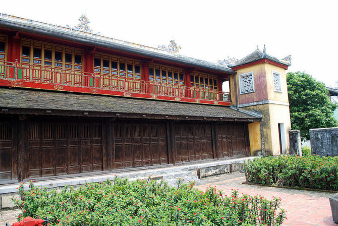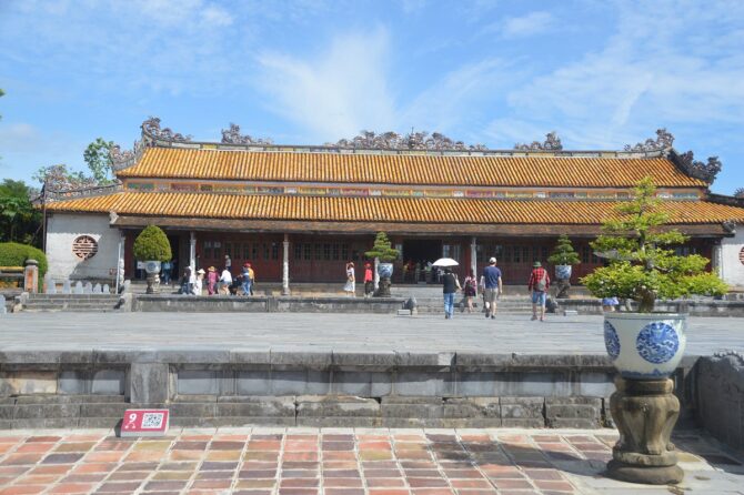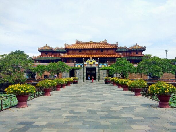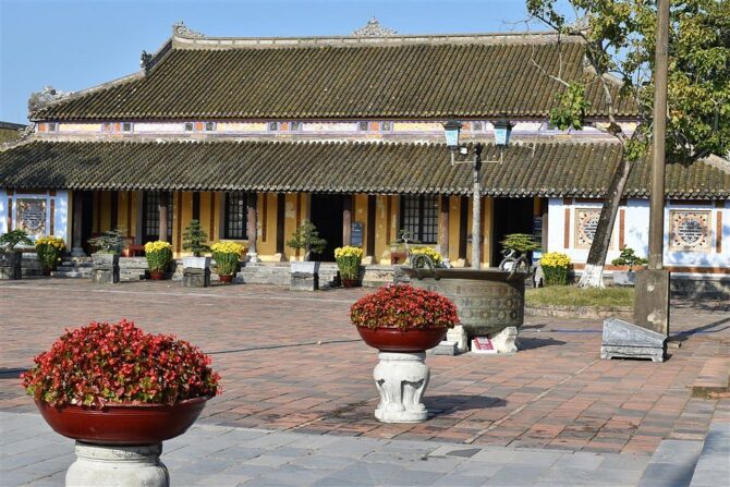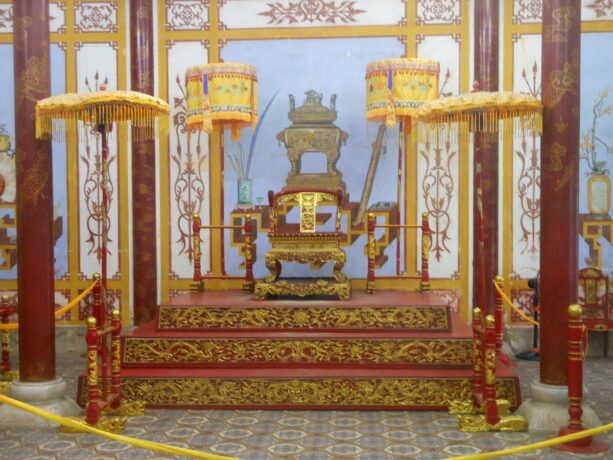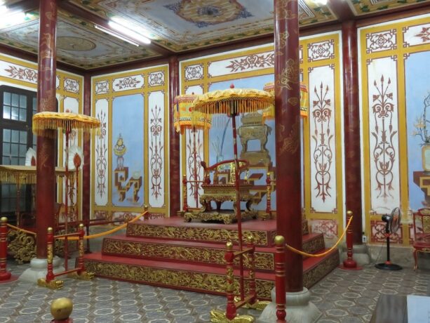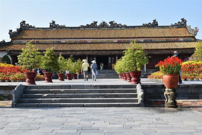 Тронный дворец или Дворец Тай Хоа – достопримечательность, мимо которой никто не проходит мимо. Название дворца несет в себе множество глубоких смыслов. Слово «Тай» означает большой, «Хоа» – гармонию всех вещей в мире. Когда все находится в гармонии, жизнь будет процветать и развиваться. Короли династии Нгуен мечтали построить сильную процветающую династию и обеспечить счастливую жизнь всей стране. Поэтому Дворец с таким названием стал их символом. Он был местом проведения важных церемоний, таких как: церемонии коронации, день рождения короля, прием посланников и встречи, проводимые 1 и 15 числа лунного месяца. В этих случаях, кроме короля, только королевской семье и четырем высокопоставленным чиновникам разрешалось входить во дворец Тай Хоа.