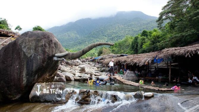 «Слоновьи источники», в отличие от двух предыдущих, являются исключительно природным объектом. Они расположены в Национальном парке Батьма, у подножия Аннамских гор, в русле притока горной реки Сун Бу Лу. Это – дикий курорт с шалашами, палаточными городками, кемпингами. Сюда организуются трекинги. После пешего перехода по горным тропам и лесным дорогам, купание в минеральных источниках Suoi Voi покажется божьей благодатью. Они находятся в долине между двумя горами, образуют несколько озер. Самое крупное из них является наиболее посещаемым. Рядом с ним организована парковка, установлены кафе и закусочные. Основные блюда готовят из только что пойманных улиток, каменных крабов и рыбы. В округе немало абсолютно диких мест, где можно полностью раствориться в волшебном мире первозданной природы.