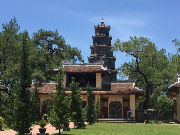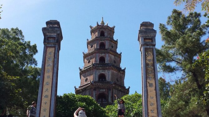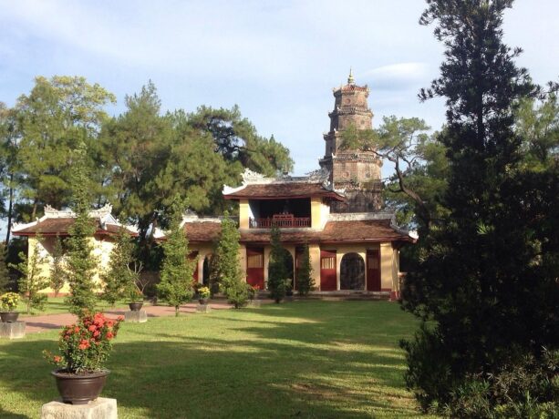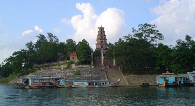 После посещения резиденции вдовствующих королев, можно спуститься по Ароматной реке до Пагоды Чудесной госпожи, также известной под названием Thien Mu. Она расположена в 3-х км от императорской цитадели. На левом берегу реки находится живописный холм Хакхе. Согласно легенде, однажды на его вершине появилась волшебница. Она предсказала появление правителя Нгуен Хоанга и новую эру в развитии страны. В ее честь в 1601 году был выстроен семи ярусный храм в традиционном буддистском стиле.