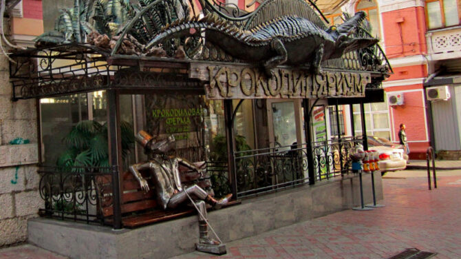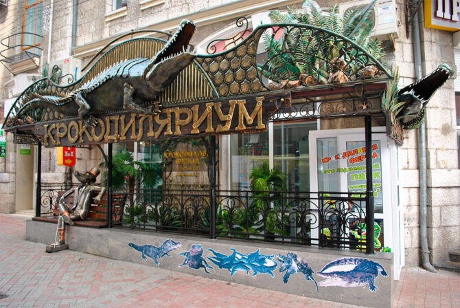 Чуть восточнее начала набережной на пересечении двух улиц – Игнатенко и Графского проезда – расположено красивое двухэтажное здание. Здесь размещаются залы Ялтинского Крокодиляриума. Это заведение с необычным названием открыло свои двери в 2011 г. по инициативе представителей администрации Алуштинского аквариума.