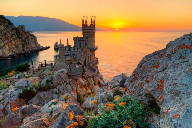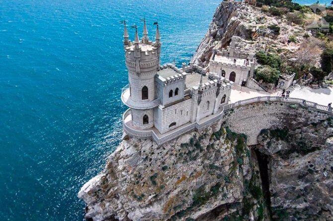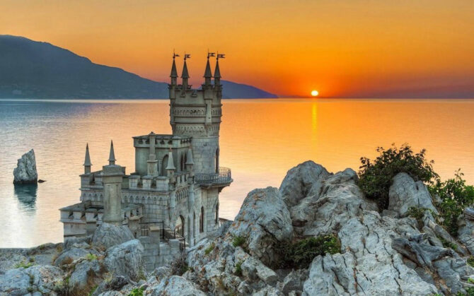 В 1 км от дворца Харакс находится один из крымских символов. О «Ласточкином гнезде» знает практически каждый турист, отдыхающий в Ялте или на другом курорте полуострова. Невысокое здание кажется величественным благодаря расположению на 40-метровой Аврориной скале. Вокруг простираются просторы Черного моря. Позади сооружения возвышаются зеленые холмы.