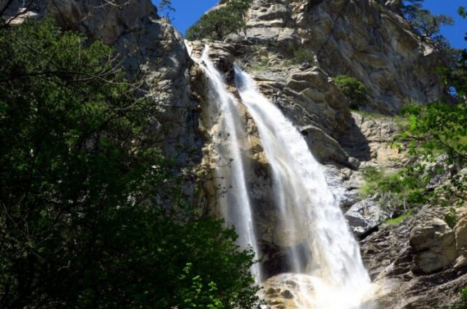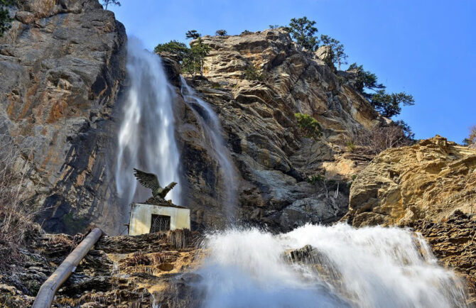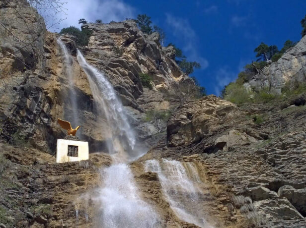 Среди природных достопримечательностей Большой Ялты выделяется «Летящая вода». Так можно перевести название водопада, находящегося в заповедной зоне в 8,6 км (по автодорогам) к западу от Ялты. Два каскада падают с высоты 98,5 м (по другим источникам – 115,5 м). Для того чтобы туристы рассмотрели природное чудо во всей красе, сооружена вместительная обзорная площадка.