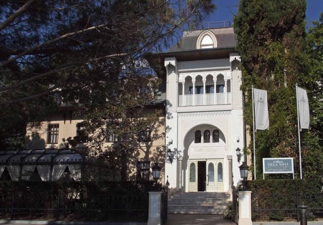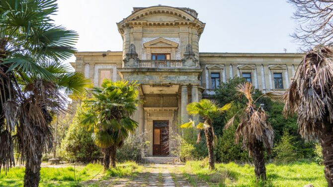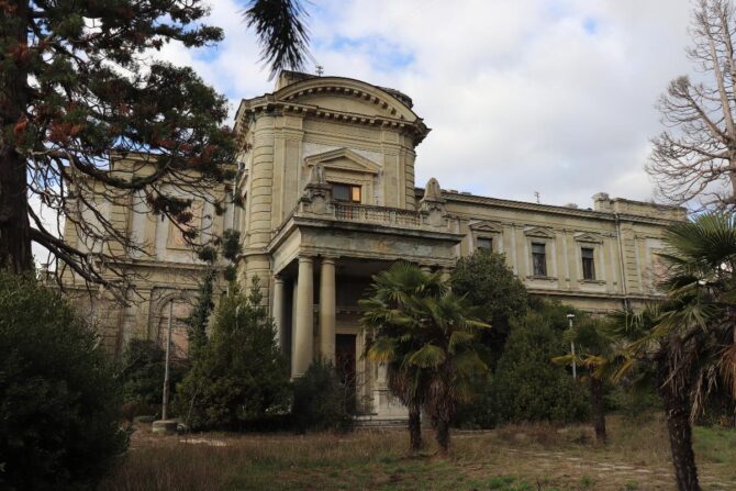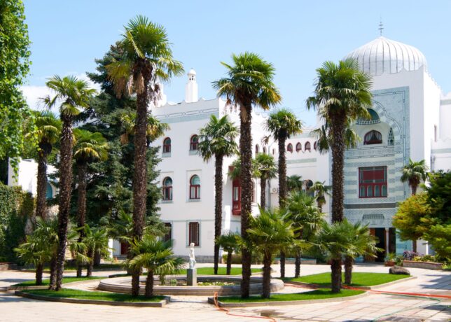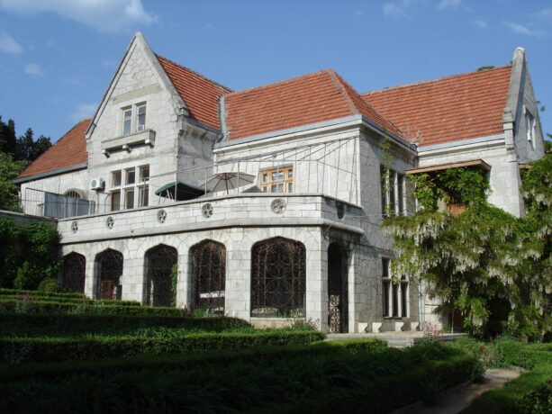 В 2 км к юго-западу от Юсуповского дворца находится «Днепр» – хорошо известный санаторий в Гаспре. На территории оздоровительного комплекса расположен небольшой дворец с необычным названием Харакс. Это место было заселено уже в древние времена. Римляне возвели здесь крепость, которая называлась Харакс. Идея создания дворца принадлежала Георгию Романову – сыну великого князя Михаила Николаевича.