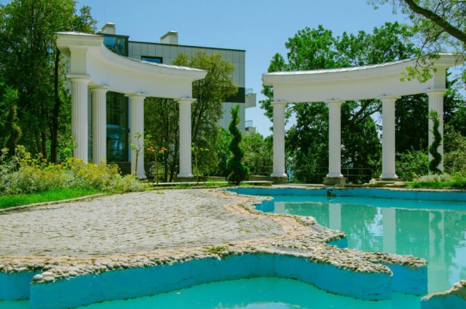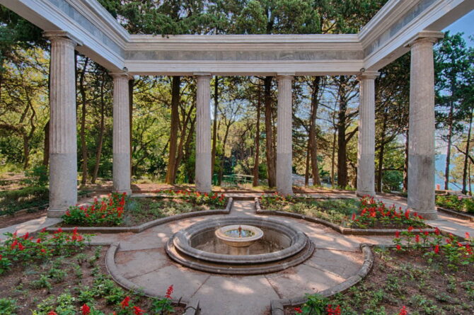 - фонтан, окруженный 12 массивными мраморными колоннами;