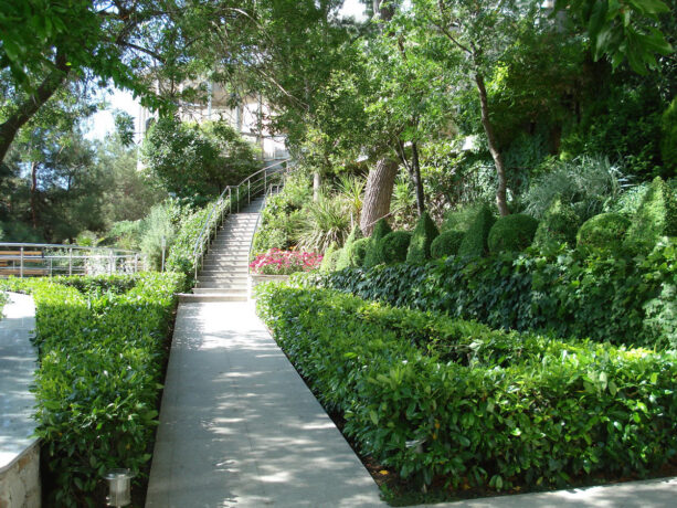 - дорожки, украшенные с обеих сторон декоративными кустарниками.