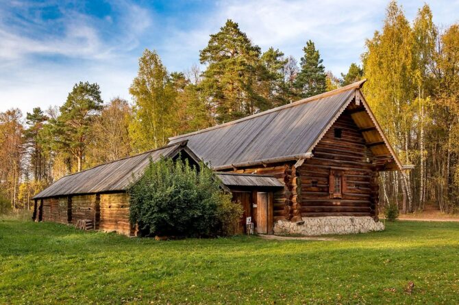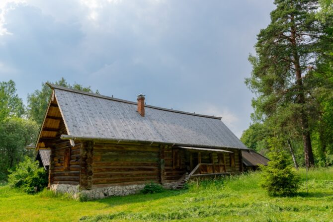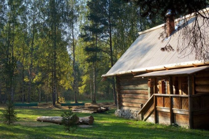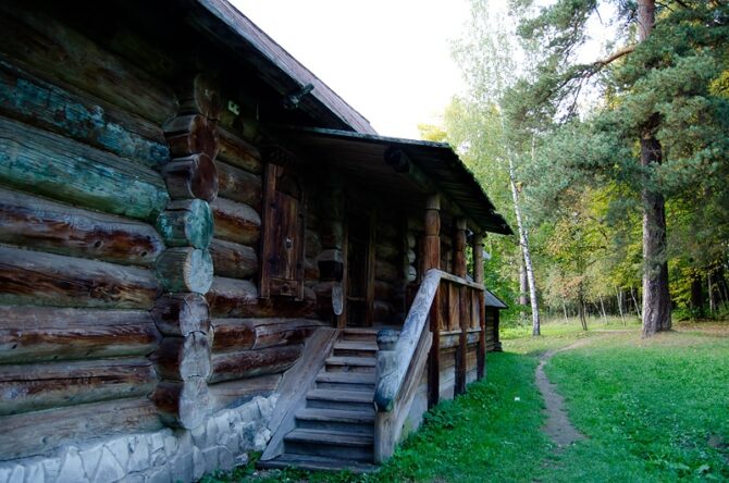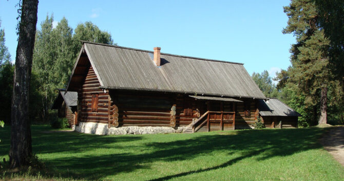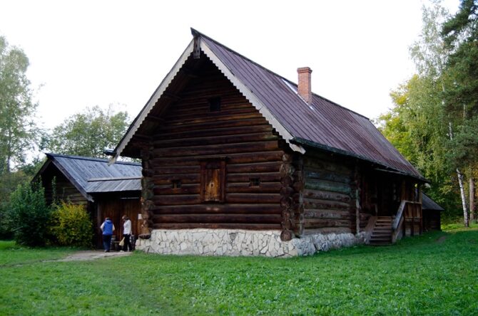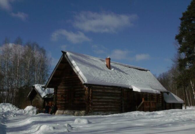 Это старинный деревянный дом в три комнаты, перевезенный сюда с юго-востока Москвы. Размеры избы не маленькие, внутри сохранена аутентичная атмосфера. Органично вписана большая дровяная печь, отдельно вынесена светлая комната, в горнице стоит допотопный ткацкий станок, устроен красный угол с иконами. Экскурсию лучше не заказывать тому, кто хоть раз читал о жизни поселян в Российской империи. Рядом с домом находится мини-конюшня и деревянная колокольня, а вот часовня сгорела в лихие 90-е.