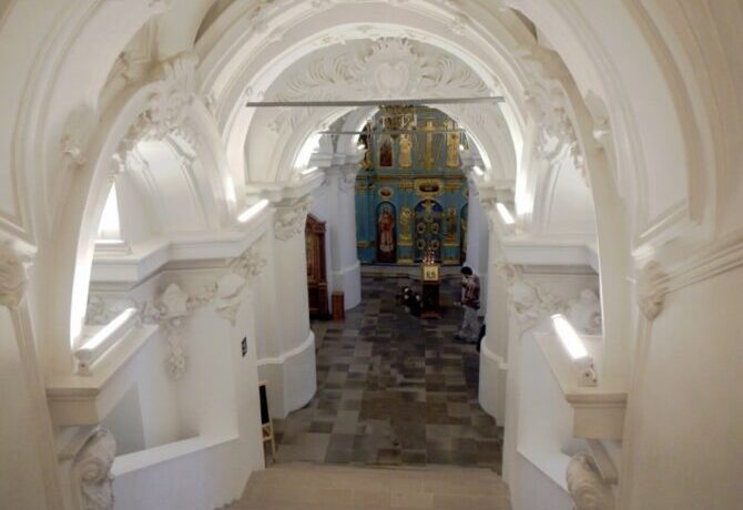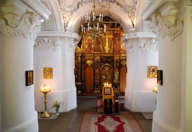 Отдельным пунктом посещения монастырского комплекса нужно считать надвратную церковь, возведенную в конце 17 века одновременно с внушительной крепостной стеной. Именно надвратная церковь встречает туристов, приехавших посетить это святое место. Архитектурный облик здания храма – восьмерик на четверике, увенчанный одноглавым куполом. Поднявшись на парапет каменной ограды, можно любоваться как панорамой монастыря, так и чудесными видами на парковую территорию.