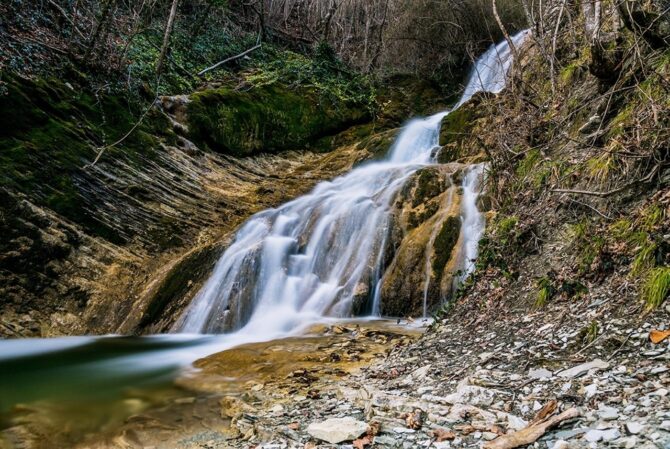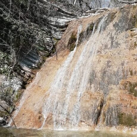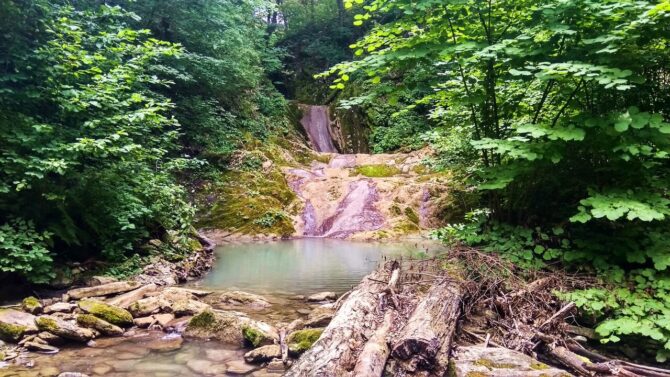 Водопад видно и слышно издалека. Он грохочет, скатываясь по каменистому руслу горного ручья в неглубокую чашу у подножия. Вода течет по уступам, образуя красивый каскад. Купаться здесь не очень удобно, но погрузить ноги в бурлящий поток и сделать несколько уникальных фоточек получится. Возле устья Крученой Щели есть небольшая зона отдыха с домиком и местом для мангала.