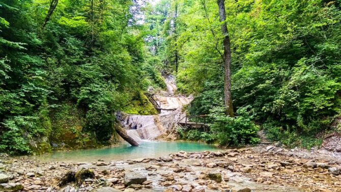 Из Кабардинки также можно отправиться на экскурсию в Долину ста водопадов. Они находятся в Плесецкой Щели в 42 км от курортной зоны. Роскошная долина реки Тхаб не перестает удивлять путешественников новыми открытиями. Никто точно не знает, сколько на ней расположено водоскатов. К части из них ведут благоустроенные тропы, а другая часть находится в труднодоступных местах. Если есть желание пройтись пешком по живописным окрестностям, то можно доехать до поселка Михайловский перевал (38 км от Кабардинки) и оставшийся путь посвятить прогулке.