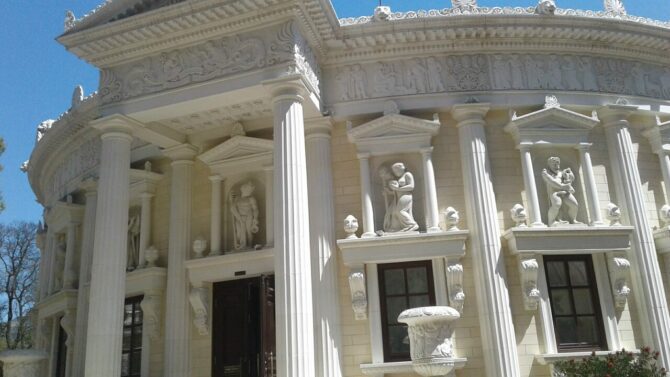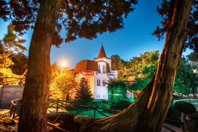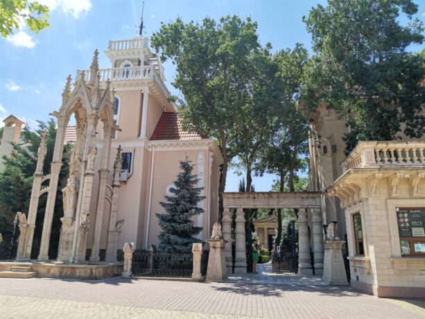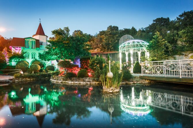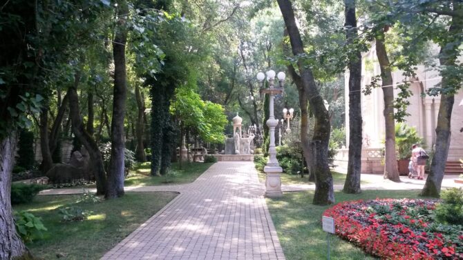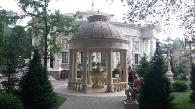Территория разбита на историко-культурные зоны: Египет, Классицизм, Готика, Дом Кавказа, римский акведук, Античность, Средневековый замок, Японский сад, классическая мечеть, православная часовня. Особый интерес представляет Дом Архитектора. В нем автор соединил несколько стилей – классицизм, готику и модерн.
