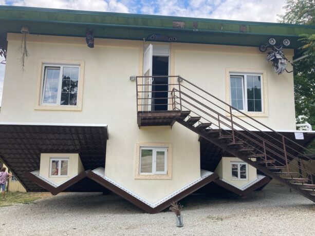 Кабардинка считается идеальным курортом для семейного отдыха с детьми. Для того, чтобы попасть к самому примечательному аттракциону поселка, нужно пройти от Океанариума по улице Революционной до памятника жертвам репрессий. Сразу за ним находится «Дом вверх дном». В нем все вещи находятся в перевернутом положении: интерьер, светильники и даже коляска возле входа. Дом состоит из прихожей, спальни, гостиной, кухни, детской и санузла. Здесь можно сделать уникальную фотосессию. Администратор подскажет, каким образом можно использовать перевернутые фотозоны.