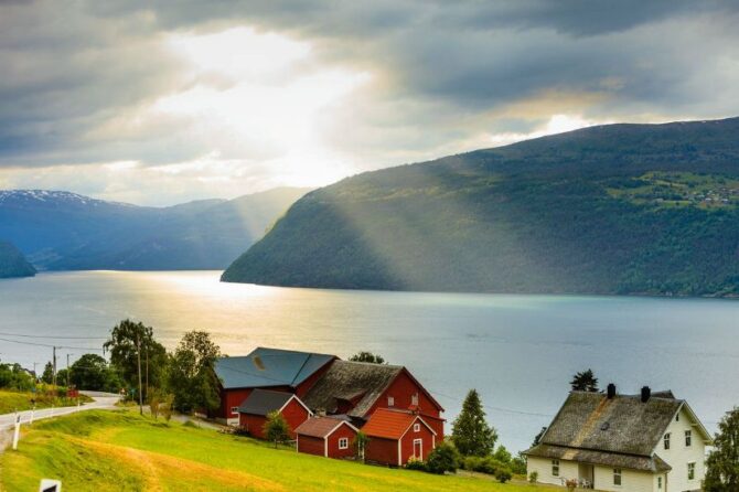 Горы словно погружаются во фьорд, а затем в океан, образуя на своем пути к морю невероятные водопады. В самой внутренней части Нордфьорда сияют ледники, зажатые между долинами и озером Хордниндалсватнет. Однако ближе к центру есть пологие холмы и гораздо более мягкий климат. Путь к морю сопровождается скалистыми берегами или песчаными пляжами. А на заднем плане виднеется плато Вест-Кейп с видом на бурные воды Стадхаветского моря. Здесь поднимается самый большой континентальный ледник, Йостедалсбреен. В зелени долин выделяется гора Скала, на вершине которой находится убежище в форме круглой башни, на высоте 1848 метров.