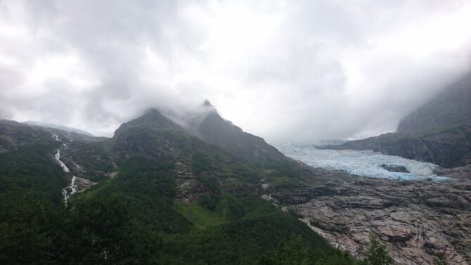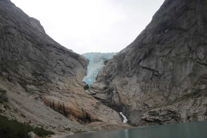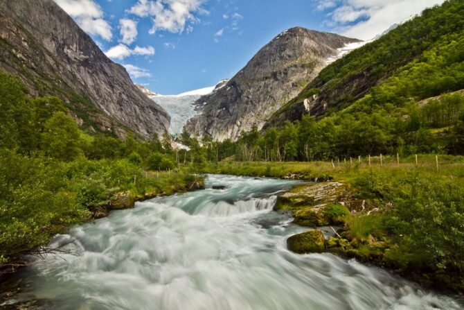 Подъем по долине — необыкновенный опыт. От Олдена вы идете вдоль ручья, который бурно спускается с ледника Бриксдаль и, расширяясь, образует три озера, окруженные крутыми горными склонами. Вы можете подняться пешком или на своеобразной тележке, запряженной лошадью-пони. Как только трасса будет закончена, продолжайте движение по тропе, которая проходит между огромными скалами, пока не достигнете подножия ледника, который с высоты 1700 метров опускается до 346 метров. Доберитесь до точки, где открывается вид на это чудо: огромная масса льда, пересеченная внезапными трещинами.