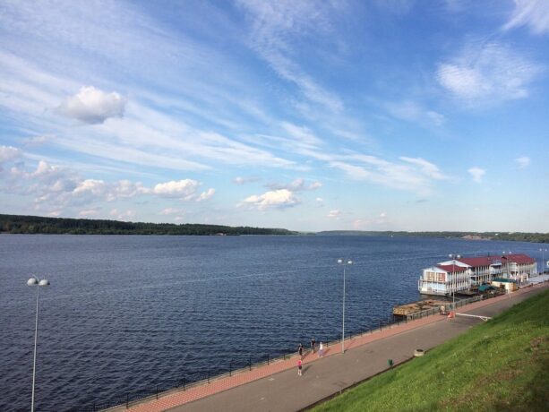 На Волжском бульваре можно снять гостиничный номер. Как таковые отели здесь отсутствуют, зато прямо на воде построена база отдыха «Мирная пристань». Она находится недалеко от Речного вокзала, который в свою очередь расположен рядом с Троицко-Успенским собором. В фонде – 34 комфортабельных номера категорий «Стандарт», Полулюкс, Делюкс и Люкс. В стоимость проживания входит завтрак, поэтому не придется заботиться о питании в начале самостоятельной экскурсии. По возвращению можно будет поужинать в одном из трех ресторанов, а также посетить развлекательную программу.