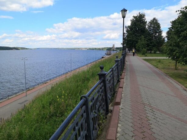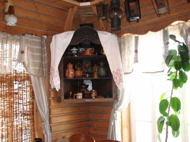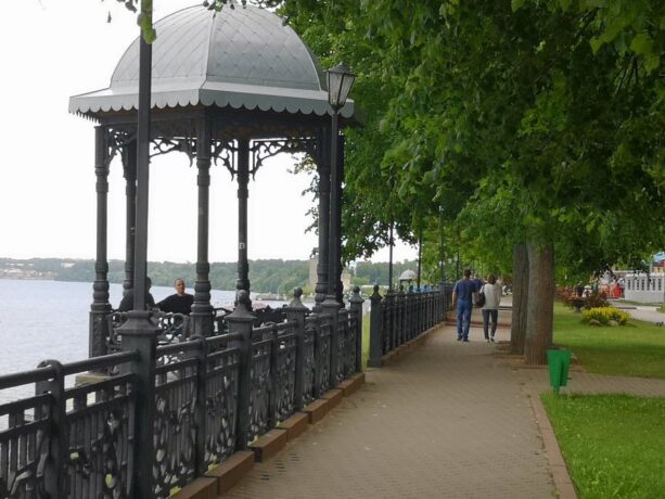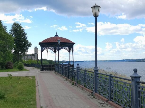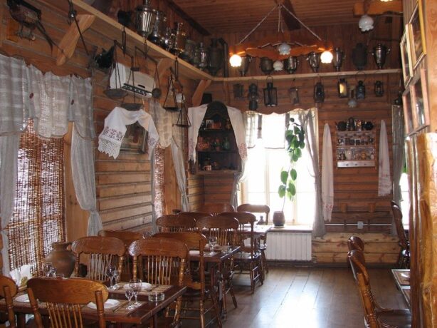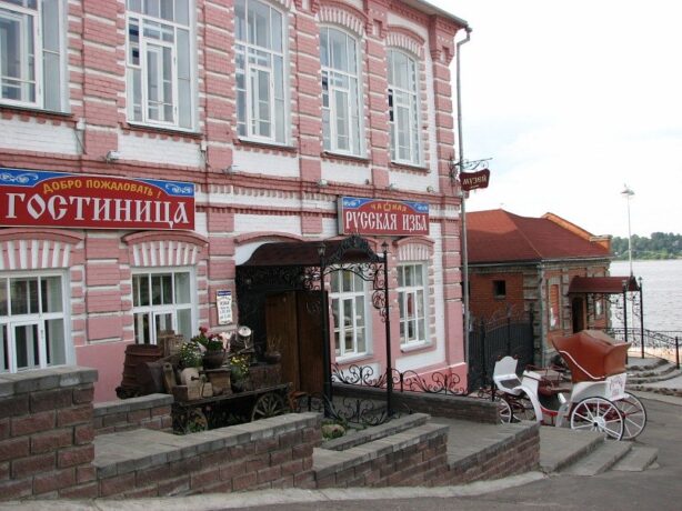 В самом начале предложенного экскурсионного маршрута находится уникальный ресторан, оформленный в стиле русской избы. В здании рядом с Речным вокзалом можно не только вкусно пообедать, но и поселиться в одном из благоустроенных номеров, расположенных на втором этаже. В стоимость проживания входит завтрак. Его можно заказать с доставкой в комнату, попросить накрыть стол на летней террасе или спуститься в ресторан, который больше походит на музей.