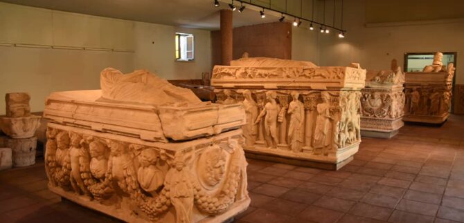 Многие артефакты находятся во дворе и в саду музейного комплекса. Ценнейшие артефакты представлены мраморными саркофагами, относящимися к эллинистическому и римскому периодам, а также византийскими мозаиками и уникальными амфорами. Конечно же, это далеко не все ценное, что есть в Археологическом музее.