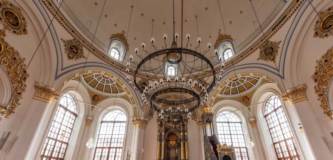 Строение укрыто восемью куполами (в том числе одним большим), располагает двумя минаретами. В интерьере много мрамора – голубого и белого.