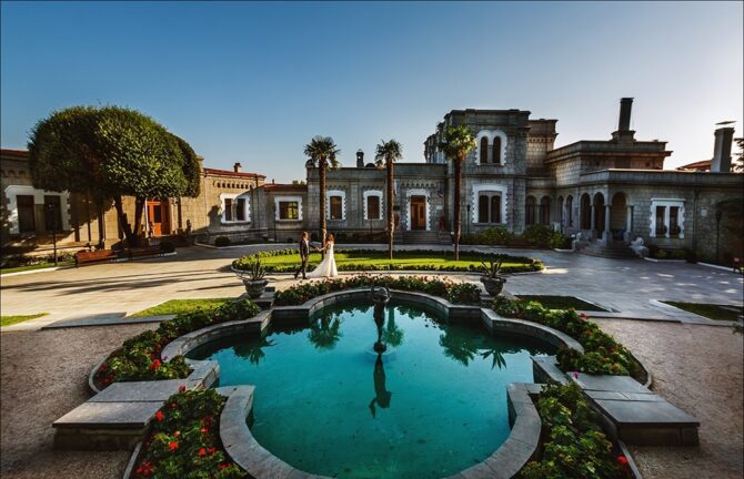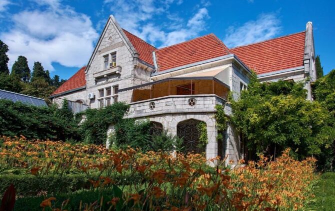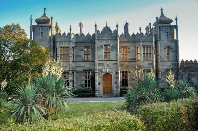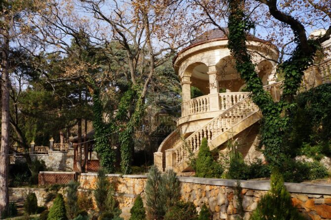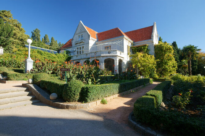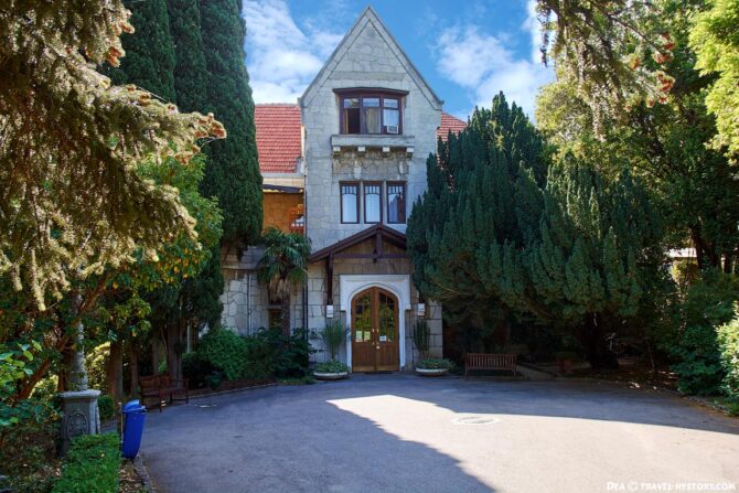 Следующая уникальная постройка также принадлежит авторству ялтинского архитектора Николая Краснова. Имение было приобретено сыном императора Николая I великим князем Михаилом в 1869 году. Он заказал построить необычный дворец в современном стиле. Архитектор выбрал поздний модерн. Он стилизовал здание на манер шотландских замков. Разные фасады придают дому оригинальный вид, особенно, если осматривать его с определенных ракурсов. На втором этаже обустроена терраса, под ней – застекленный зимний сад. Вокруг строения был разбит парк, который сегодня представляет собой очередное чудо ландшафтного искусства. От входа в здание до берега Черного моря проложена каменная лестница.