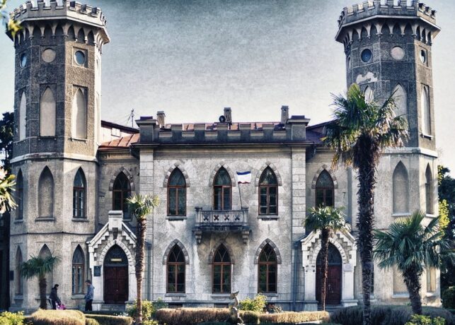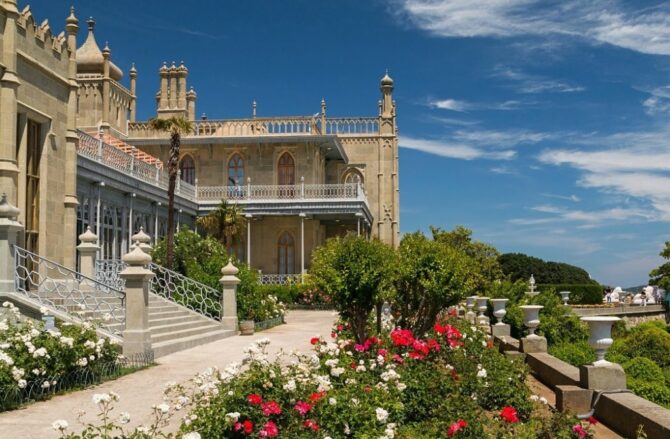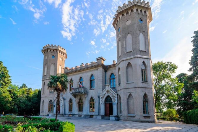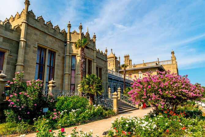 Дворец графини Паниной является архитектурной жемчужиной соседнего поселка Гаспра. Сейчас здание и парковая зона находятся в составе санатория «Ясная поляна», но посетить объект культурного наследия могут все желающие. Строительство дворца пришлось на первую половину 19-го века. Участок принадлежал императорскому сановнику А.Н. Голицыну. Князю не хватало времени на обустройство территории. Хлопоты по возведению здания взяла на себя его родственница княгиня Анна Сергеевна. Она наняла архитекторов Эльсона и Грута, которые возвели прекрасный дворец в духе романтизма. В честь действующего императора его назвали «Романтической Александрией».