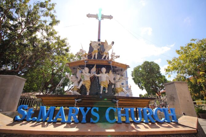 Церковь Святой Марии — самая крупная и впечатляющая их католических храмов Негомбо. Внешне она выглядит очень оригинально, интерьер выполнен в бирюзовых и голубых оттенках. Потолок украшен древними фресками, внутри также можно любоваться великолепными религиозными статуями.
