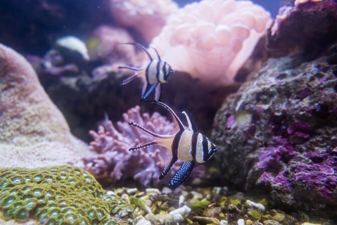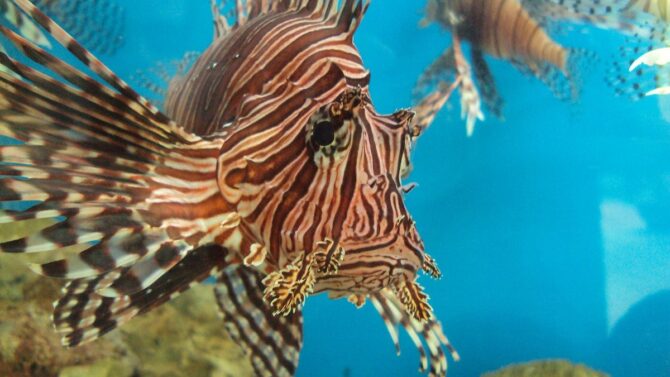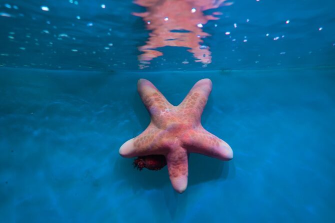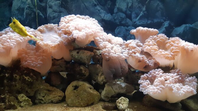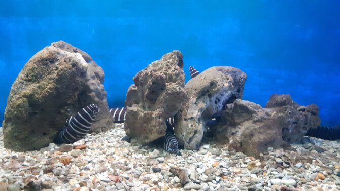 - внешнюю на палубе и стенах океанариума; здесь в аквариумах и искусственных гротах обитают скаты, макрели, лобстеры, тунцы и кальмары;