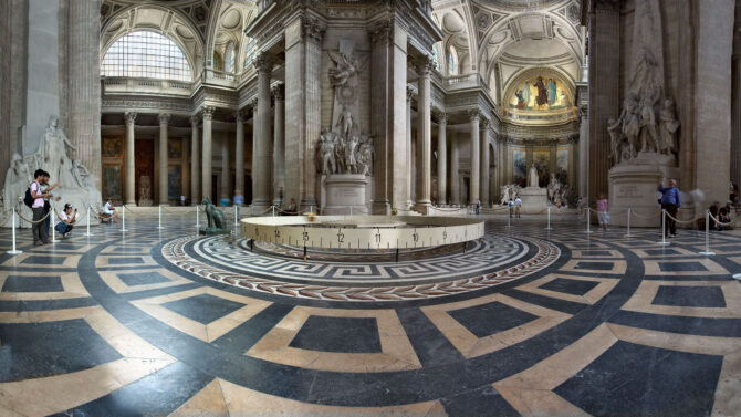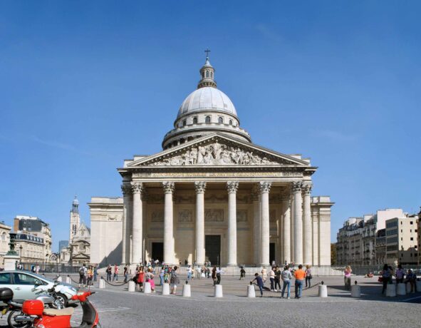 Собор был построен в непривычном для французов скромном стиле. Его вход украшает греческий портик с колоннами, а крышу здания венчает величественный купол, опирающийся на массивные стойки из мрамора. В смутные революционные времена Пантеон избежал печальной участи многих городских церквей только из-за того, что в нем решено было хоронить великих людей.