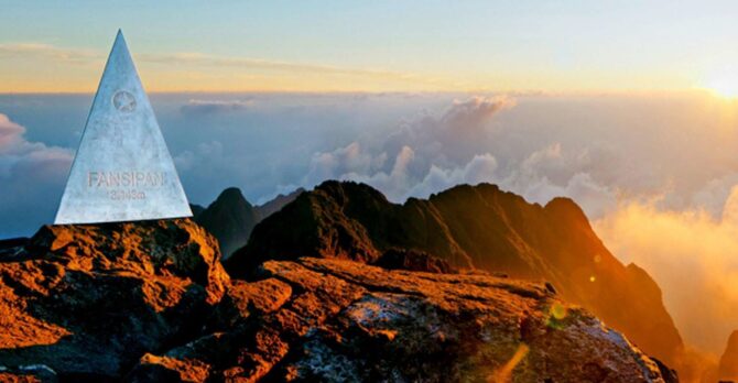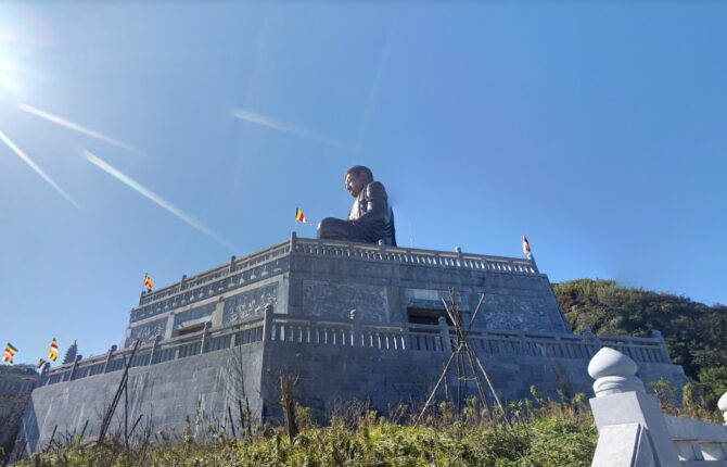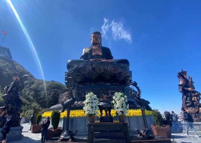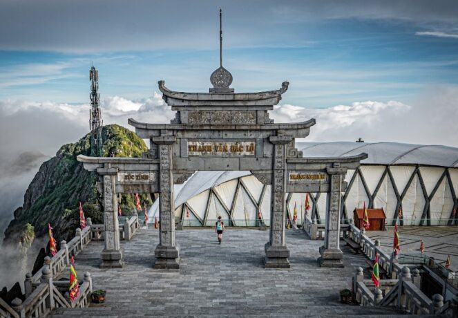 Вершина обозначена обелиском в виде пирамиды и национальным флагом Вьетнама. У альпинистов принято устанавливать флаг своей страны на покоренном пике. Туристы, пусть и по канатной дороге, но тоже являются покорителями вершин. Оформленная смотровая площадка станет для них уникальной фотозоной. На верхней станции работает ресторан с панорамным остеклением. В ясную погоду отсюда открываются виды, о которых можно только мечтать. В пасмурную погоду все закрыто облаками и хороших фотографий сделать не получится. Рядом с кафе работает сувенирная лавка. На самой вершине горы возведена пагода, на крыше которой установлена огромная статуя Будды, сидящего в позе медитации.