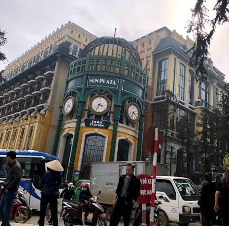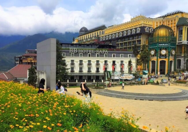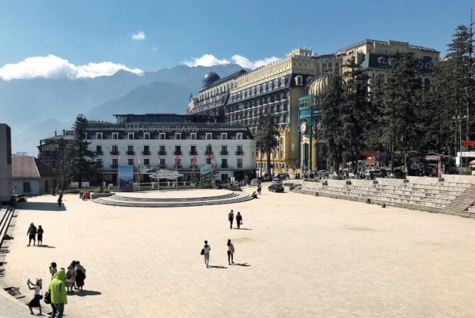 Путешествие к вершине начинается с внешне оригинального места – помпезного центра Сан Плаза. Здание с гостиничными номерами построили китайцы для своих туристов. Сапа – это пограничный город, буквально в нескольких километрах находится Китай. С этой станции отправляется фуникулер. Здание станции привлекает внимание своим колоритом. На его фоне любят фотографироваться даже те, кто не собирается подниматься на гору. Эклектичный вокзал построен напротив каменной церкви Нотр-Дам. На первом этаже находятся кассы, несколько сувенирных магазинчиков, отель занимает несколько этажей. Это хорошее место для остановки транзитных путешественников, так как оно находится близко от транспортных путей и достопримечательностей. Отели, расположенные в центре Сапы не такие громоздкие, более милые и уютные.