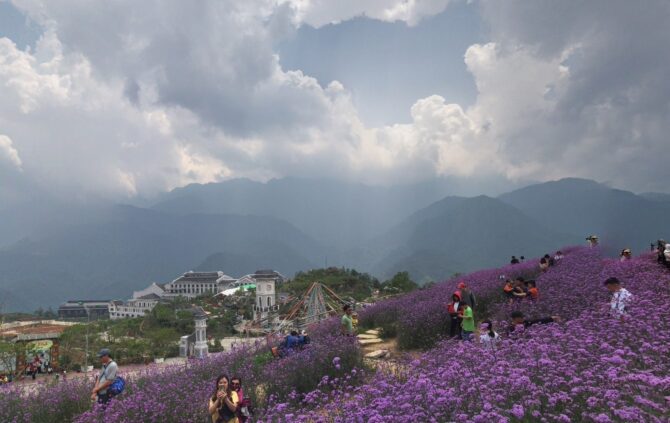На второй станции по дороге на вершину можно выйти и пройтись по красочному парку Sun World Fansipan Legend. Благоустройство территории началось в 2018 году и продолжается до сих пор. Поезд останавливается на красивой станции, откуда стартует канатка к смотровой площадке. В отличие от Сан Плаза, здешний терминал – это современное здание, построенное в европейском стиле. От его входа в сторону парка уводят просторные дорожки. По задумке авторов дизайн-проекта, вся площадь разбита на тематические зоны. На одном из горных лугов среди лаванды и подсолнухов установлены шалаши. Он напоминают стога сена, но в них можно укрыться от знойного солнца. У каждого имеется вход и небольшая терраса.