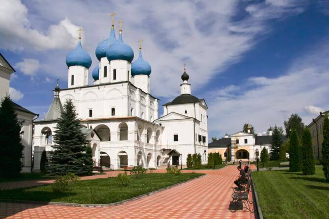 Для того, чтобы посетить женскую православную обитель, нужно перебраться на другой берег реки Нара. Введенский Владычный женский монастырь основан в 1360 году. До 1806 года в нем проживали братья-монахи. После обитель отдали сестрам. Сохранившиеся храмы были построены с период 16-17 веков. Все они являются объектами национального наследия. Паломники приходят сюда, чтобы поклониться иконам с мощами святых Никиты Столпника и Лазаря Четверодневного, а также чудотворному образу Божией матери «Всецарица». Наиболее интересными архитектурными объектами являются Собор Введения во Храм Пресвятой Богородицы (построена во времена правления Бориса Годунова), храм великомученика Георгия Победоносца (конец 16 века), церковь святителя Алексия (17 век), надвратная церковь мученика Феодота Анкирского (1599 г.).