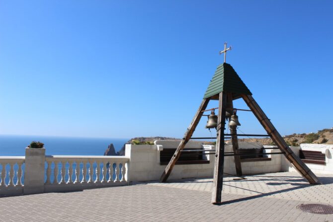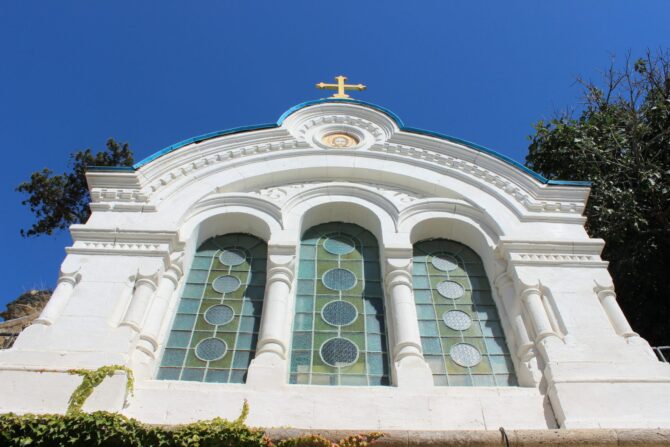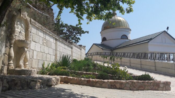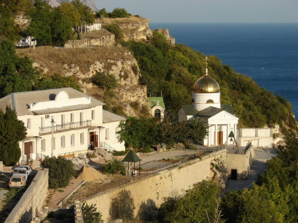 Свято-Георгиевский монастырь на мысе Фиолент – еще одна православная обитель Севастополя. Однажды в 890 г. греческие мореплаватели были застигнуты штормом в районе мыса, с трудом они причалили к берегу, чудесным образом оставшись в живых. Оказавшись на суше, они стали усердно молится, и произошло чудо – им явился Св. Георгий, после этого явления буря начала стихать. На выступе скалы путешественники обнаружили икону Георгия Победоносца, приняв это за знак свыше, в одной из пещер они основали храм. Постепенно обитель разрасталась, появился храм Рождества Христова, появилась купальня, паломническая гостиница. Сейчас в море неподалеку от береговой линии на небольшой скале установлен крест в память об этих событиях.