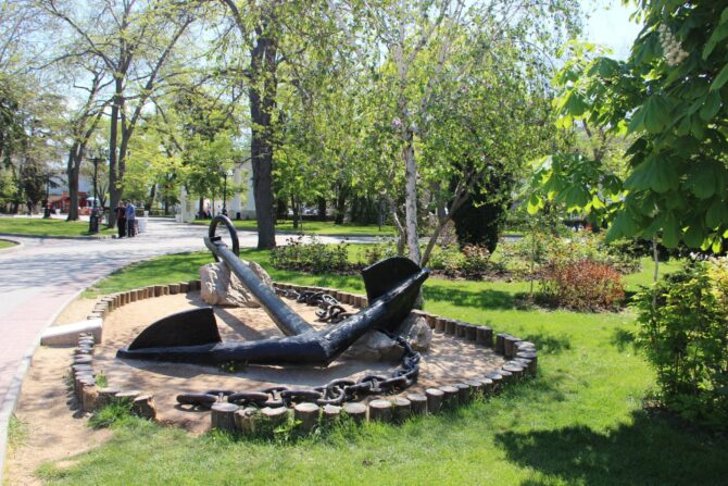 Памятник затопленным кораблям представляет собой мощный семнадцатиметровый столп, выполненный в античном стиле и расположенный прямо в воде. Монумент укреплён своеобразной каменной насыпью. Его венчает скульптура орла, держащего в клюве якорь. Памятник был открыт в 1905 г.