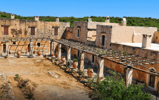 История первых построек монастыря началась еще в Венецианском периоде, тогда появились храм Преображения Господня и пределы Святых Константина и Елены. Монастырь-это настоящая крепость в хозяйственными постройками во дворе, мощными стенами с вышками и бойницами. В 100 м от монастыря стоит ветряная мельница, ставшая склепом для бойцов-героев Восстания 1866 года. Как несколько веков, так и сейчас, для водоснабжения монастыря пользуются подземными хранилищами и скважинами неподалеку.
