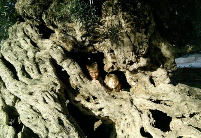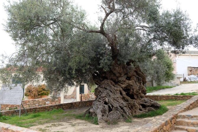 Чтобы полюбоваться уникальным оливковым деревом, поезжайте в местечко Элефтерна. И взрослые, и дети поражаются интересной форме его кроны и размеру: 15 человек могут встать вокруг ствола. Говорят, дерево живет уже 3000 лет, и за год ствол увеличивается в размере на 0,6 мм.