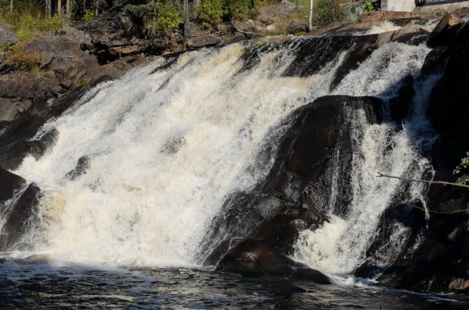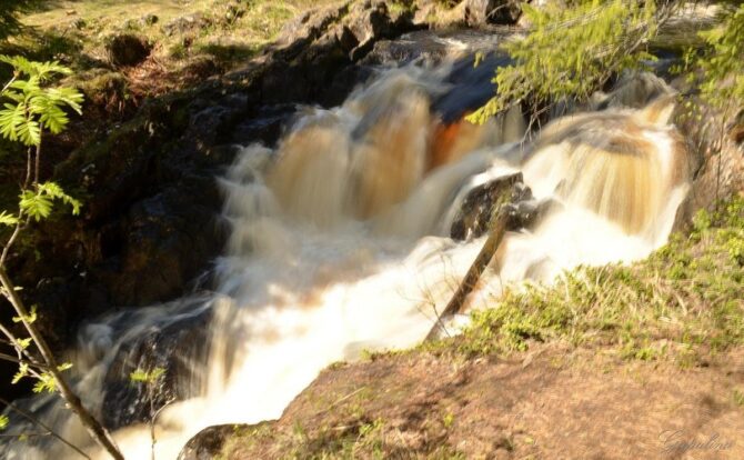 Каскад из 4 водопадов окружен рекой, вечнозелеными елями и огромными скалистыми склонами. Струи водопада с громким шумом разбиваются о скалы и реку, превращаясь в пену и опрыскивая все вокруг миллионом брызг. Окружающий пейзаж настолько живописен, что кажется, будто водопад нарисован, а не реален.