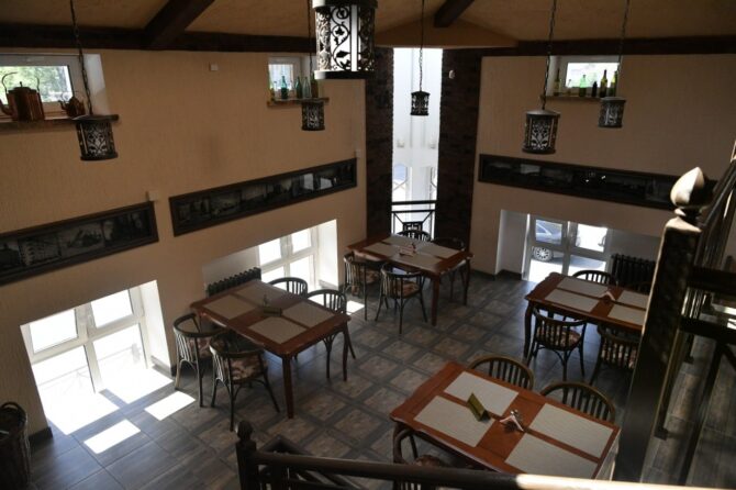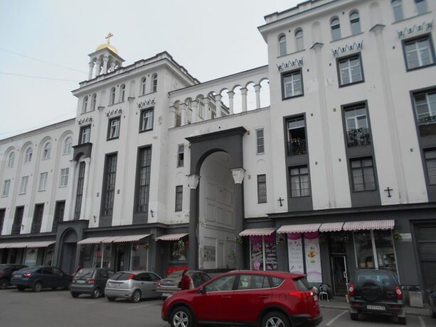 Кирпично-гипсовое здание визуально разделено на четыре разновысоких объема. Слева четырехэтажная часть здания с двускатной крышей. Правое крыло здания состоит из двух пятиэтажных строений, одно из которых представляет собой беседку с куполом и крестом. Верхние части здания соединены трехэтажной инсталляцией с круглой аркой.