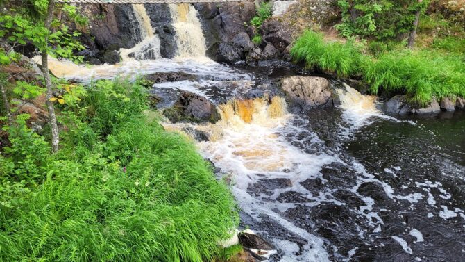 Отличительной особенностью Рускеальских водопадов и реки является цвет воды. Из-за высокого содержания железа и торфяных почв водопад имеет насыщенный красновато-коричневый оттенок.