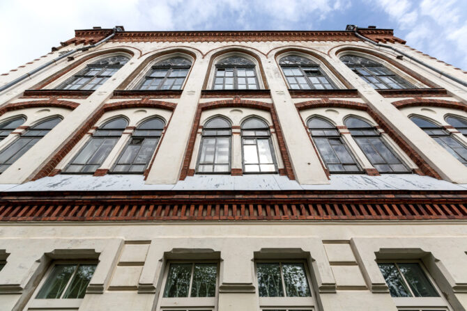 Главный фасад здания по улице Гагарина асимметричен. Слева четырехэтажное здание в виде башни, увенчанное двумя вертикально расположенными готическими фронтонами с характерным узором: кладка из красного кирпича. Этот объем здания перекрыт высокой двускатной крышей; справа трехэтажное здание под четырехскатной крышей с центральным входом в здание в виде большого крыльца с арками.