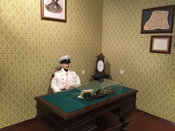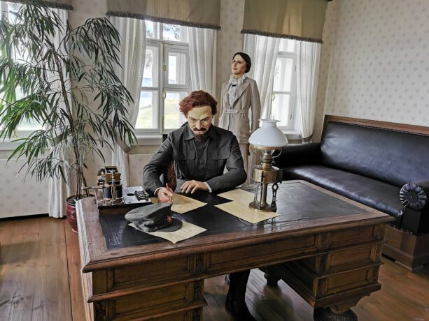 - воссозданный кабинет Л. Троцкого, где за столом сидит фигура самого революционного вождя;