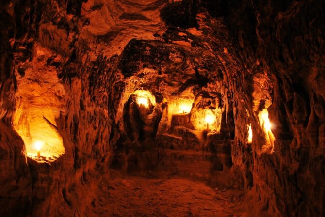 Кроме великолепных голубых озер и прекрасного дворца Бобринских, в окрестностях Богородицка есть одно уникальное место – Гремячевские карстовые пещеры. Их еще называют Араповским подземным монастырем. Кто и когда создал катакомбы, не известно. Говорят, что в них жили древние люди. В средние века они служили блокпостом на тульских рубежах. Для современных путешественников – любителей спелеологии их существование открыл обычный крестьянин Яков Павлов из села Гремячее, который вместе с товарищами искал уединенное место для моления. Таким образом подземные пещеры на время превратились в своеобразный монастырь, но губернатор в 1856 году решил закрыть вход в катакомбы из-за опасности обвалов. Река к тому времени подмыла берега, лес на них был вырублен, песчаные наносы разрушали пещеры. До наших дней сохранилось около 200 метров подземных тоннелей. По всему периметру есть углубления в стенах для свечей. Но без специальной экипировки ходить сюда не рекомендуется. Расстояние от Тулы до поселка Гремячее составляет 93 км.