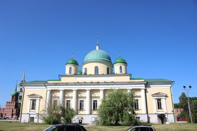 Православный собор будет интересен не только верующим, но и всем ценителям искусства. Это главный храм города. Он возводился с 1762 по 1766 годы. Имя автора проекта кануло в Лету, а непосредственными строителями стали тульские каменщики, ремесленники, кузнецы и купцы, которые давали деньги на позолоту для куполов и другие декоративные элементы. Величественное здание с колокольней выполнено в стиле русского барокко. Внутренние стены расписывали ярославские художники-иконописцы. Иконы для семи ярусного иконостаса писали тульские мастера. Из 66 икон до нашего времени сохранились 56. Во многом это благодаря тому, что после закрытия в 1930 году, вся церковная утварь, иконы и облачения собора были переданы действующей Николочасовенской церкви. В 1945 году Успенский собор был причислен к памятникам архитектуры прошлых столетий. Ему удалось избежать участи Казанского собора в Санкт-Петербурге и не стать музеем истории атеизма. В 1960 году здание было поставлено под государственную охрану. Еще год в нем находился склад каких-то товаров, а потом началась новая жизнь. Реставрационные работы начались в 1965 году и длились до 1991 года, пока храм не был передан в руки тульской православной епархии. Теперь здесь находится кафедральный собор Тулы, а также проводятся экскурсии от имени областного краеведческого музея.