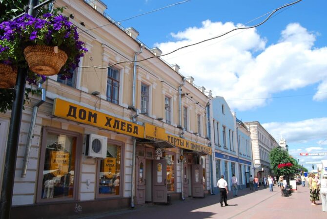 Архитектурный ансамбль улицы составляют двух и трехэтажные старинные особняки. Но присутствует и доля эклектики. Например, в самом начале над уютными домами тучей, сделанной из металла и стекла, нависает суперсовременный гипермаркет «Олимп». Дальше все становится гармоничным. Атмосфера окунает туриста в очарование русского провинциального города. Практически все здания имеют историческую значимость. Во многих особняках на первых этажах размещены небольшие кафе и ресторанчики. В советское время улица носила имя революционера Урицкого. В 1992 году ей вернули прежнее название.