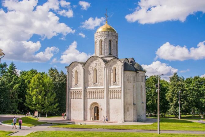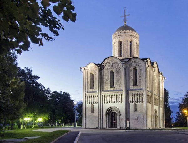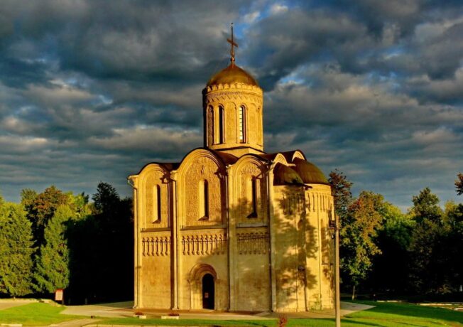 Второй по исторической значимости храм – Дмитриевский собор – возведен по указу князя Всеволода Юрьевича Большое Гнездо. Ранее это была территория княжеского двора, на которой и был построен белокаменный собор, ставший каноном крестово-купольных православных церквей владимиро-суздальского зодчества. Храм был освящен в честь великомученика Димитрия Солунского, небесного покровителя Великого князя. Впервые был упомянут в Радзивилловской летописи, где указывались даты постройки, но ученые до сих пор ведут споры об их точности. Они варьируются с 1191 по 1197 годы. Русскими мастерами для строительства использовался белый известняк. Здание знаменито своей белокаменной резьбой. С 1992 года объект включен в список архитектурных памятников Всемирного наследия ЮНЕСКО.