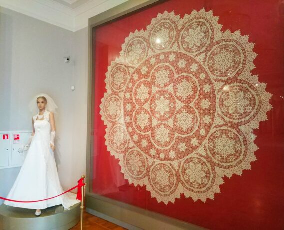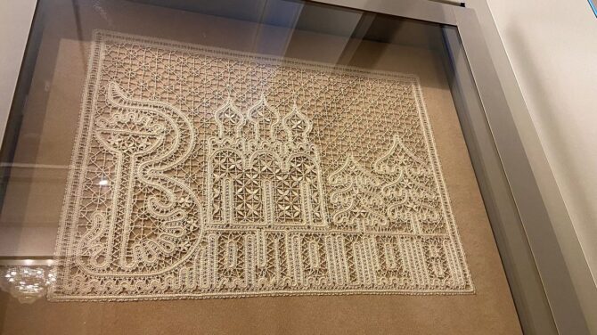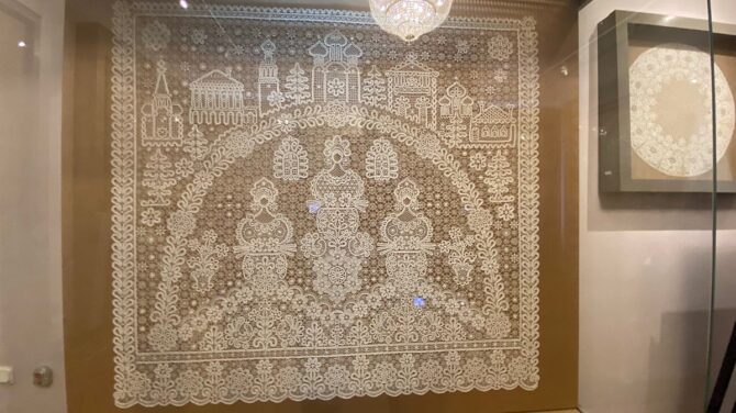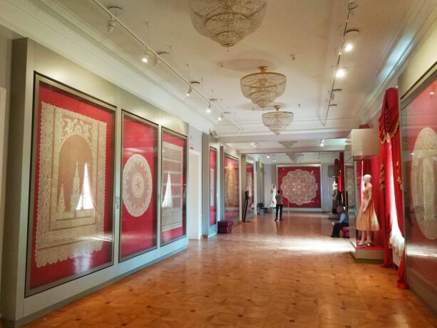 Плетение кружева – один из традиционных промыслов вологодских рукодельниц. В конце 19-го века местные изделия вышли на мировой рынок и получили всемирное признание. Экспозиция выстроена по хронологии развития промысла. Экспозиционные залы и главная галерея расположены на втором этаже. На первом находятся выставочные залы, магазин-салон, кафе, учебный класс. Традиции мастериц прошлых веков сегодня продолжает коллектив ООО «Вологодская кружевная фабрика «Снежинка». Ее продукции посвящен один из залов галереи.